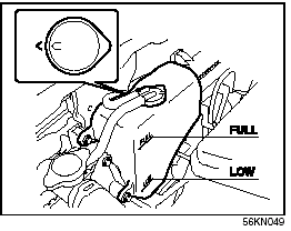 If the engine coolant level is below the “LOW” mark, more engine coolant should be added. Remove the reserve tank cap and add engine coolant until the reserve tank level reaches the “FULL” mark. Never fill the reserve tank above the “FULL” mark.